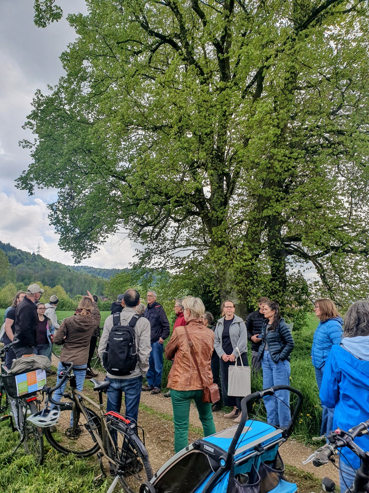 Auf dem Spaziergang, der dem Stadtbach entlang zum Sportplatz und weiter über das Sprecher+Schuh- sowie Henz-Areal zum Bahnhofplatz führte, gab die Baumpflegespezialistin Sibylle Trüb spannende und anregende Einblicke in das Leben von Einzelbäumen, jüngeren Baumreihen und neu gepflanzten Baumgruppen. Die kulturhistorische Bedeutung und Entwicklung, die Schwierigkeiten von Erhalt und Förderung, aber auch der Nutzen von Bäumen für Mensch und Umwelt sorgten für angeregte Diskussionen, die später auf dem Gilgenplatz beim gemütlichen grillieren fortgesetzt wurden.