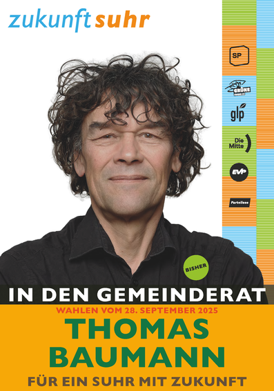 Wir von «Zukunft Suhr» freuen uns sehr, Thomas Baumann als Gemeinderat und als Vizepräsident zur Wahl stellen zu dürfen. Thomas ist seit 2014 Gemeinderat, Mitglied der Grünen und hat sich unter anderem mit seiner Kompetenz im Ressort „Bau, Verkehr und Umwelt“ einen Namen gemacht.